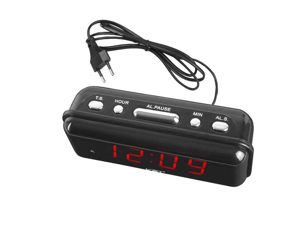Praktické stolní hodiny s budíkem. Zobrazují hodiny a minuty v podobě velkých číslic (cca.28mm) červené barvy. Napájení pomocí síťového kabelu.