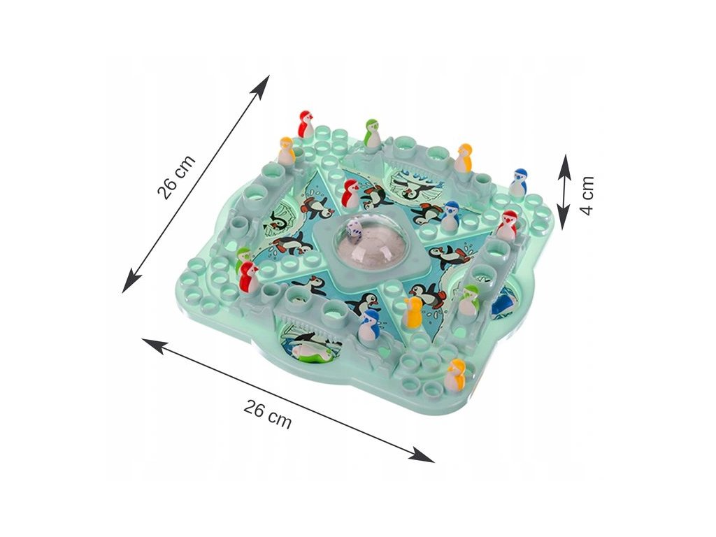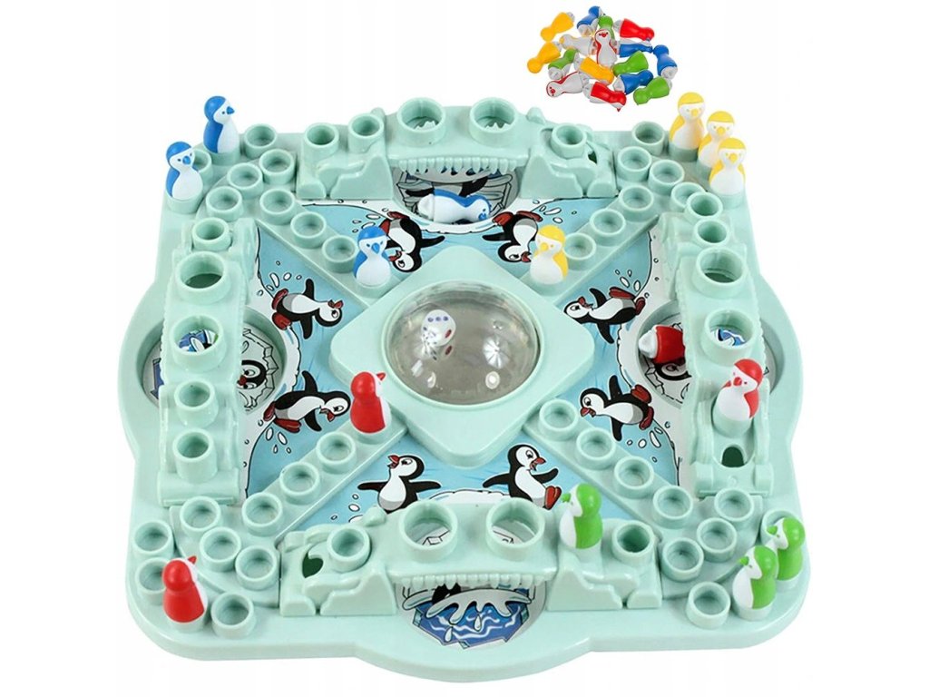 Umíte hrát člověče nezlob se? Umíte tedy hrát i tučňáky! Rozložte hru a umistěte mosty na určených místech podle herního plánu. Tučňáci, uložení podle barev, čekají na svůj tah, stejně jako u člověče. Startuje osoba, která po stisknutí průhledné polokoule umístěné na prostředku hrací plochy hodí 6 jako první. Kostka je uzavřena v polokouli a nemusíte se bát, že se někde ztratí nebo že by ji dítě polklo.Tučňáci postupují o tolik polí, kolik si vylosují na herní kostce. Během hry můžete pohybovat pouze jedním svým tučňákem. Kdy Váš tučňák vstoupí na pohyblivou část „ledového mostu”, můžete využít možnosti nastražit past a tučňáka protivníka shodit do ledové vody. Tučňáci se z vody vracejí na místo startu. Aby jste tučňákem mohli zase pokračovat, musíte hodit na kostce 6. Vyhrává ten, kdo obejde všemi tučňáky celou hrací plochu a umíst je do domečku.