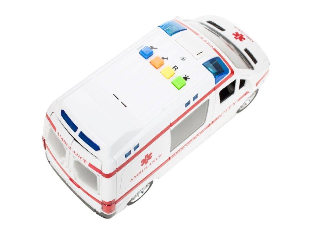 Po stisknutí tlačítek na střeše sanitky uslyší dítě různé zvuky, kupř. střelba vozidla, zvuk sirény, troubení a sanitka spustí svá světla.