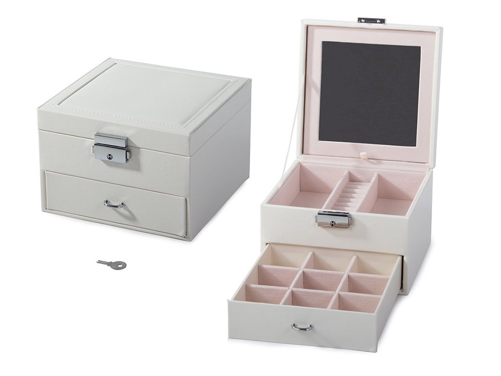 Ideální volba na dárek pro vaši přítelkyni / manželku / přítele. Atraktivní vzhled, chrání šperky před prachem a poškrábáním. Šperkovnice obsahuje kromě různorodých přihrádek a hlubokého šuplíku také praktické zrcátko. Uschováte do ní prsteny, náušnice, přívěsky i jiné doplňky.
